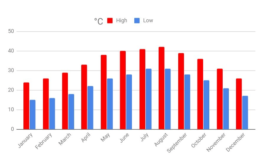 | June to August | 33 – 42°C | Summer – Hot |